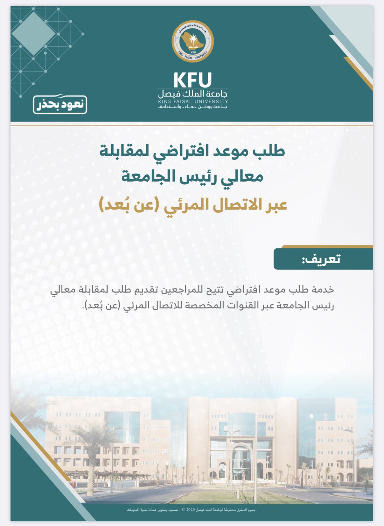 جامعة الملك فيصل على تويتر جامعة الملك فيصل تقدم خدمة طلب موعد افتراضي تتيح للمراجعين تقديم طلب لمقابلة معالي رئيس الجامعة عبر القنوات المخصصة للاتصال المرئي عن بعد من خلال الرابط التالي Https T Co Zmwnzd1bcm ويمكنكم
