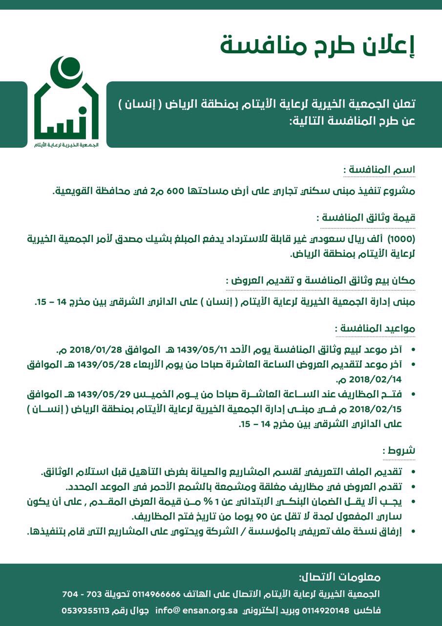 تعلن الجمعية الخيرية لرعاية الايتام بمنطقة الرياض أنسان عن طرح المنافسة التالية الجمعية الخيرية لرعاية الايتام إنـسان