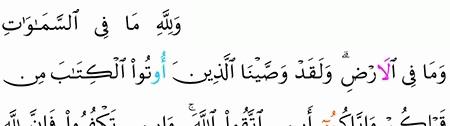 و ل ل ه م ا ف ي الس م او ات و م ا ف ي ال أ ر ض و ل ق د و ص ي ن ا ال ذ ين أ وت وا ال ك ت اب م ن ق ب ل ك م و إ ي اك م أ ن ات ق وا الل ه و إ ن ت ك ف ر وا ف إ ن ل ل ه م ا ف ي الس م او ات و م ا ف ي ال أ ر ض و ك ان الل ه غ ن ي ا